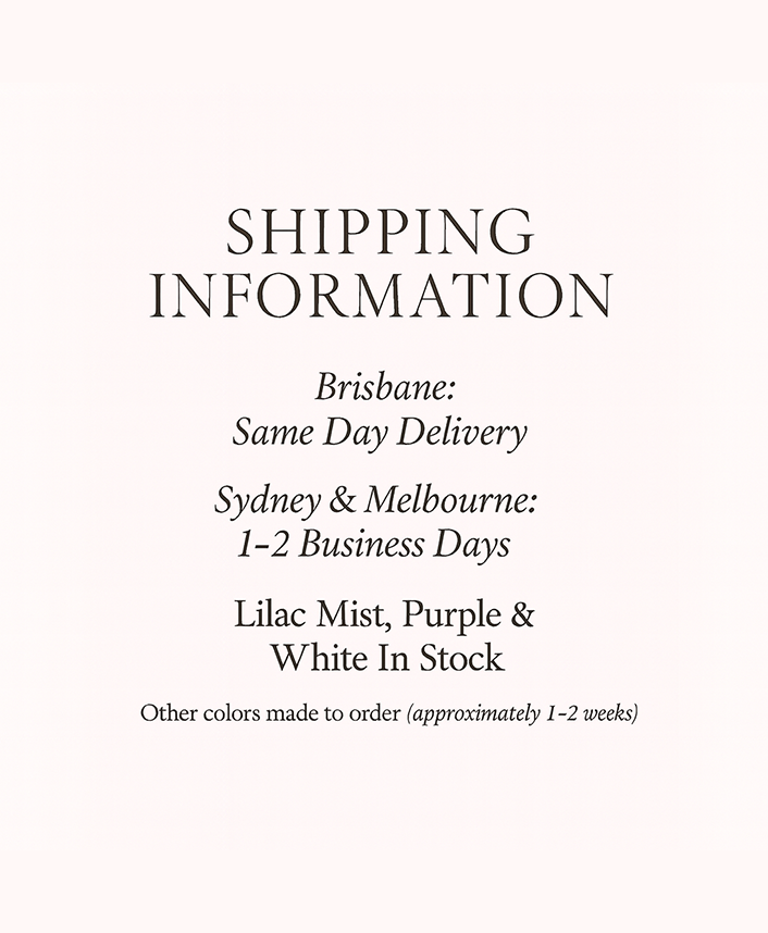 Our most popular shades—Lilac Mist Purple&whit—are always in stock and ready to ship. Other colours are made to order and will be delivered in approximately 1–2 weeks.